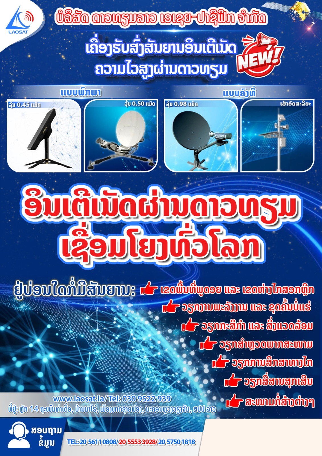 High-throughput satellite internet equipmentLAOSAT provides high-throughput satellite internet equipment services.For more product information, please contact: 20 5611 0808,20 5553 3928,20 5750 1818